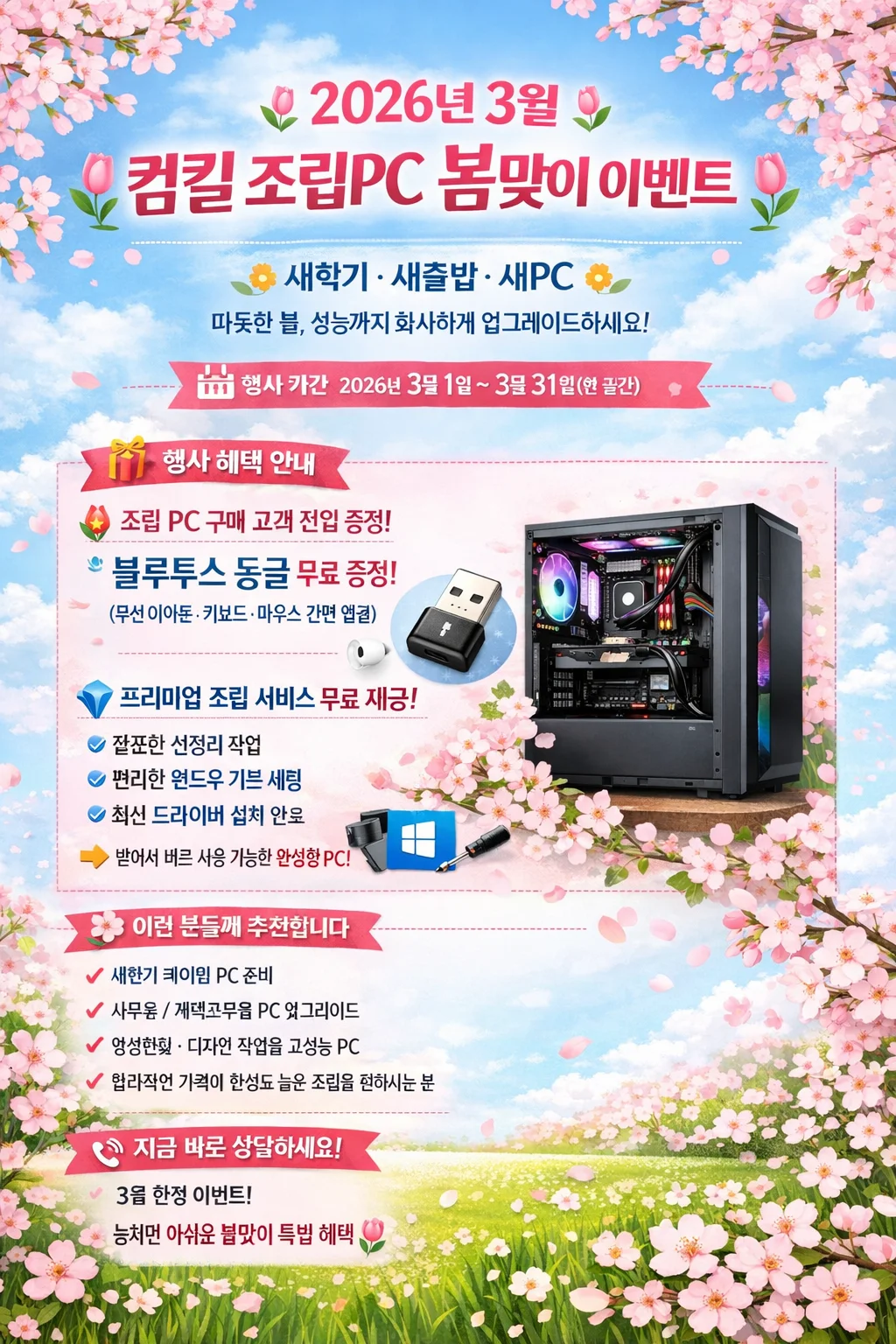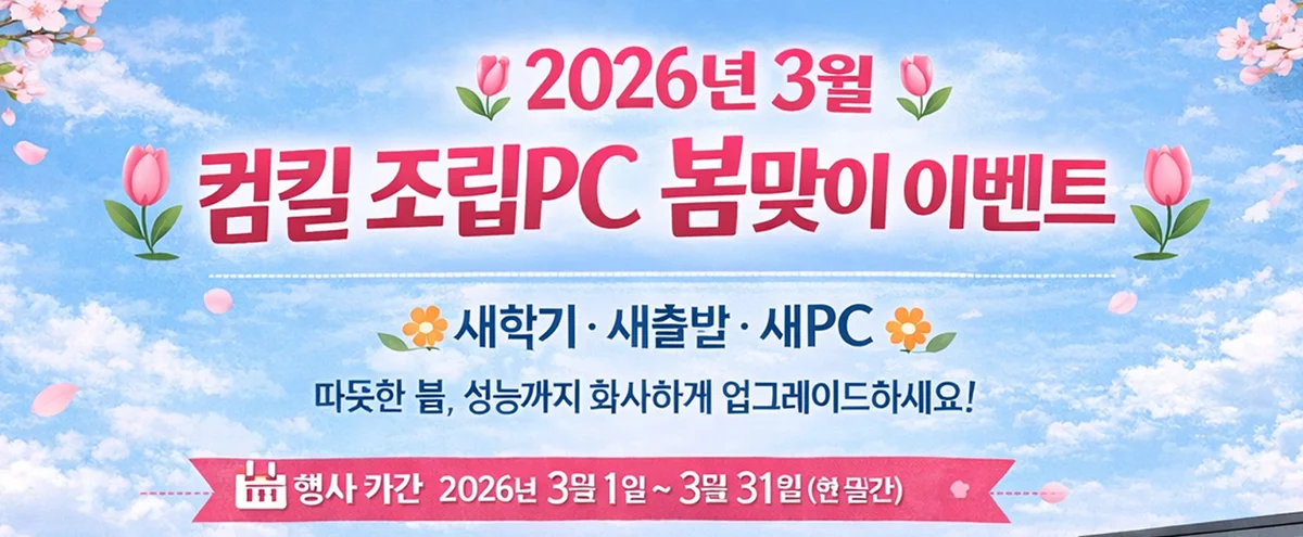 🌷 2026년 3월 컴킬 조립PC 봄맞이 이벤트 🌷 🌼 새학기 · 새출발 · 새PC 🌼 따뜻한 봄, 성능까지 화사하게 업그레이드하세요! 📅 행사 기간 2026년 3월 1일 ~ 3월 31일 (한 달간) 🎁 행사 혜택 안내 🔥 조립 PC 구매 고객 전원 증정! 🎧 블루투스 동글 무료 증정! (무선 이어폰 · 키보드 · 마우스 간편 연결) 💎 프리미엄 조립 서비스 무료 제공! ✔ 깔끔한 선정리 작업 ✔ 편리한 윈도우 기본 세팅 ✔ 최신 드라이버 설치 완료 👉 받아서 바로 사용 가능한 완성형 PC!