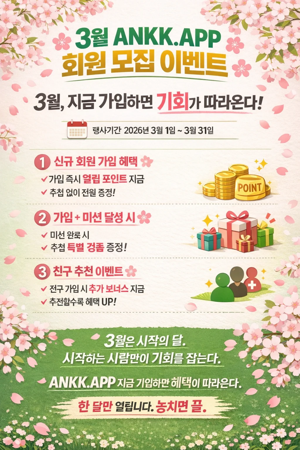 🌸 3월 ANKK.APP 회원 모집 이벤트 🌸 “3월, 지금 가입하면 기회가 따라온다” 📅 행사기간 2026년 3월 1일 ~ 3월 31일 🎁 이벤트 혜택 1️⃣ 신규 회원 가입 혜택 가입 즉시 사용 가능한 웰컴 포인트 지급 추첨 없이 전원 증정 (조건 없음) 2️⃣ 가입 + 활동 미션 달성 시 활동 미션 완료 고객 중 🎉 추첨을 통해 특별 경품 증정 3️⃣ 친구 추천 이벤트 친구 1명 가입 시 추가 보너스 지급 많이 추천할수록 혜택 증가 🎯 이벤트 메시지 문구 (전단지용 카피) “3월은 시작의 달. 시작하는 사람만이 기회를 잡는다.” “ANKK.APP, 지금 가입하면 혜택이 따라온다.” “한 달만 열립니다. 놓치면 끝.” 🔥 홍보용 짧은 문구 (SNS용) 3월 한정 회원 모집 START 가입만 해도 혜택 지급 친구 추천하면 보너스 추가 3월 31일 마감